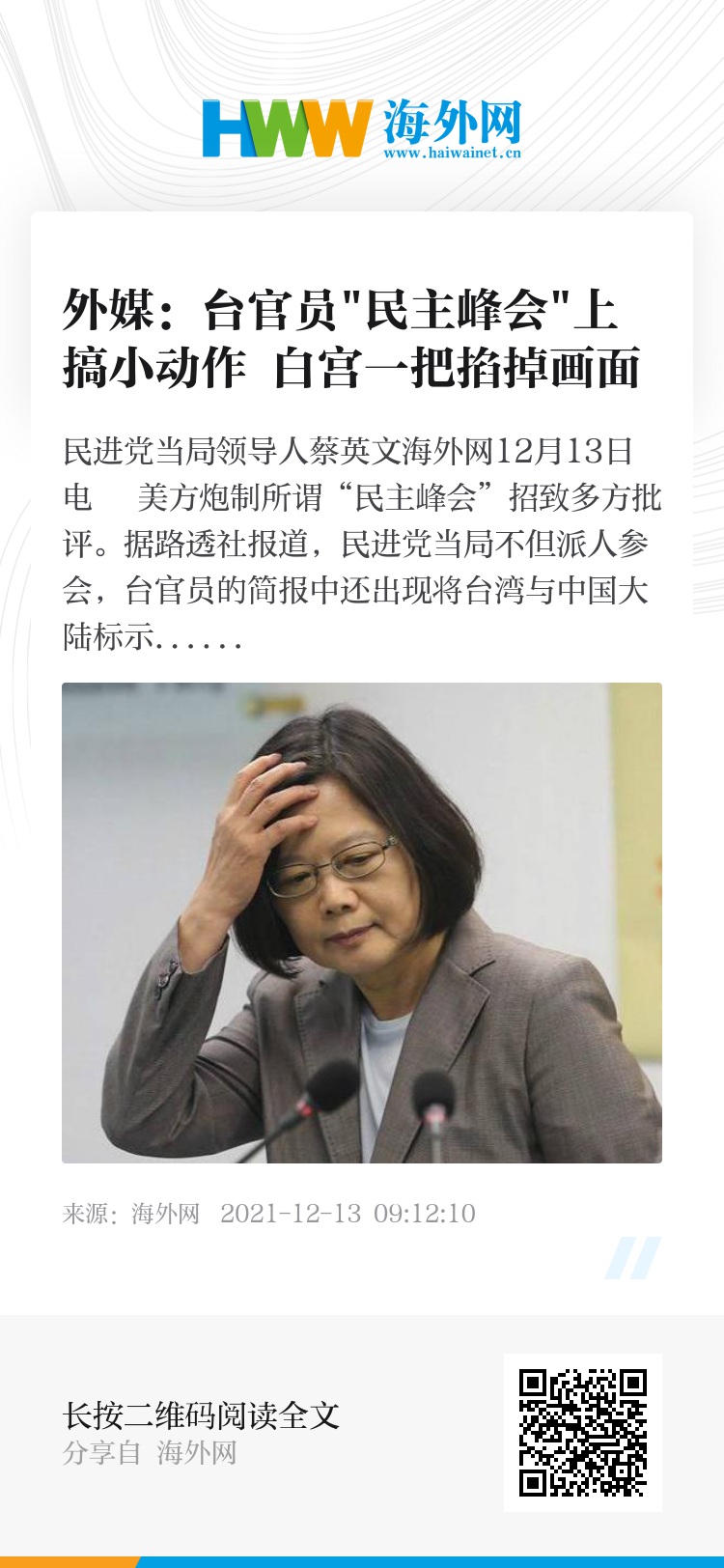 海外网12月13日电 美方炮制所谓“民主峰会”招致多方批评。据路透社报道,民进党当局不但派人参会,台官员的简报中还出现将台湾与中国大陆标示为不同颜色的问题地图,白宫官员“乱了手脚”,连忙掐掉画面。台网友讽刺民进党当局“搞小动作被揭穿丢人现眼”“‘台独’弄巧成拙”。