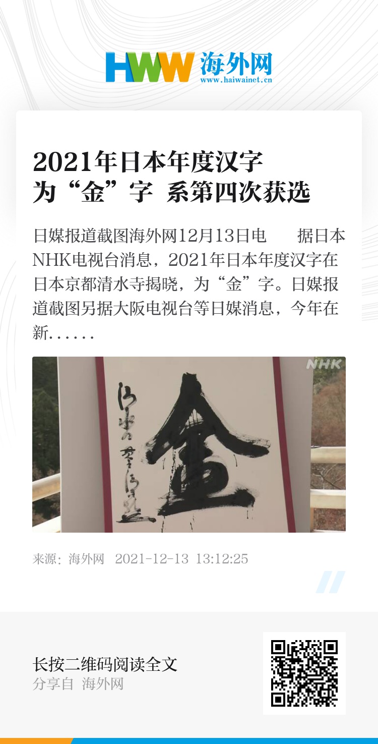 海外网12月13日电 据日本NHK电视台消息,2021年日本年度汉字在日本京都清水寺揭晓,为“金”字。