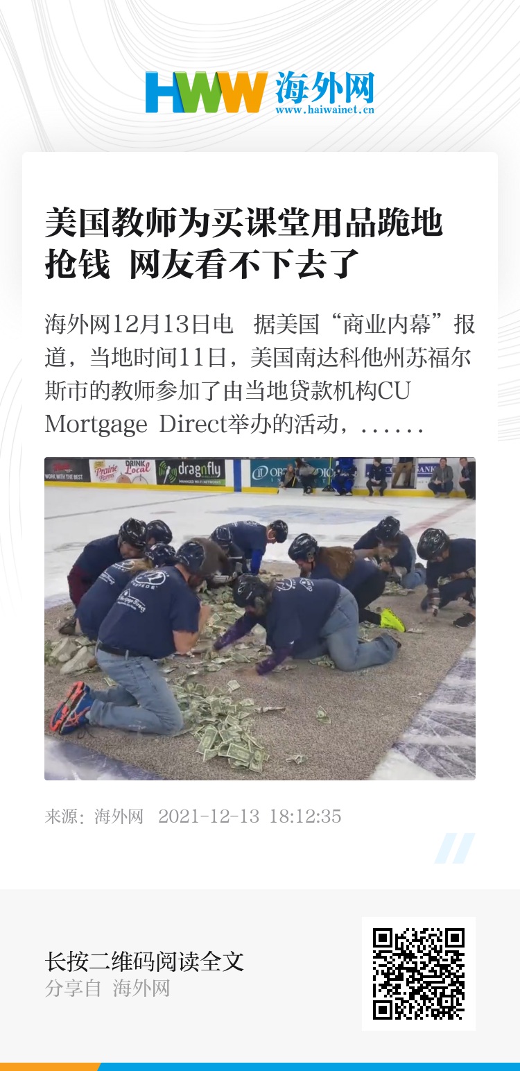 而该活动的视频上传至推特后,网友表示,这种争抢现金的行为“有辱人格”,跟乞丐抢面包没什么两样。美国有线电视新闻网主播比尔·威尔(Bill Weir)在推特上写道:“为取悦苏福尔斯的冰球爱好者,让教师在冰面上爬来爬去,为课堂用品筹集资金。我们离公共教育的‘乌贼游戏’也不远了。”(海外网/李芳 实习编译/谢瑞琛)