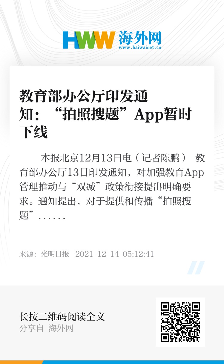 本报北京12月13日电(记者陈鹏) 教育部办公厅13日印发通知,对加强教育App管理推动与“双减”政策衔接提出明确要求。通知提出,对于提供和传播“拍照搜题”等惰化学生思维能力、影响学生独立思考、违背教育教学规律的不良学习方法的作业App,暂时下线。整改到位并经省级教育行政部门审核后,方可恢复备案;未通过审核的,撤销备案。