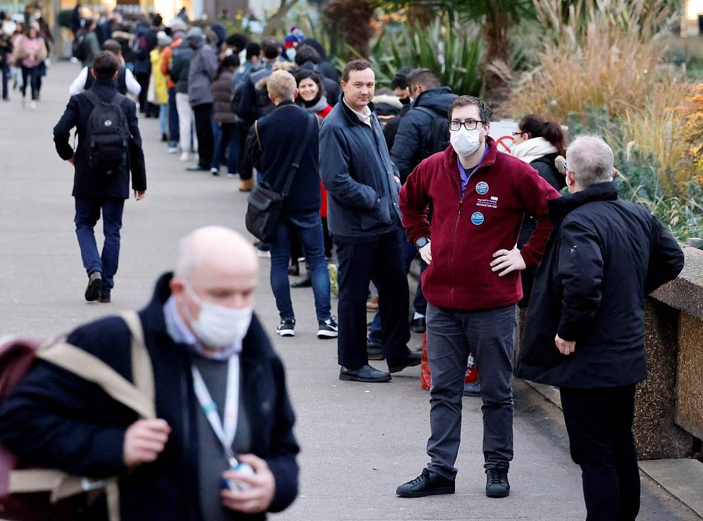 当地时间12月13日,英国伦敦,新冠疫情下的街头景象,民众在新冠疫苗接种中心前排队。图片来源:视觉中国