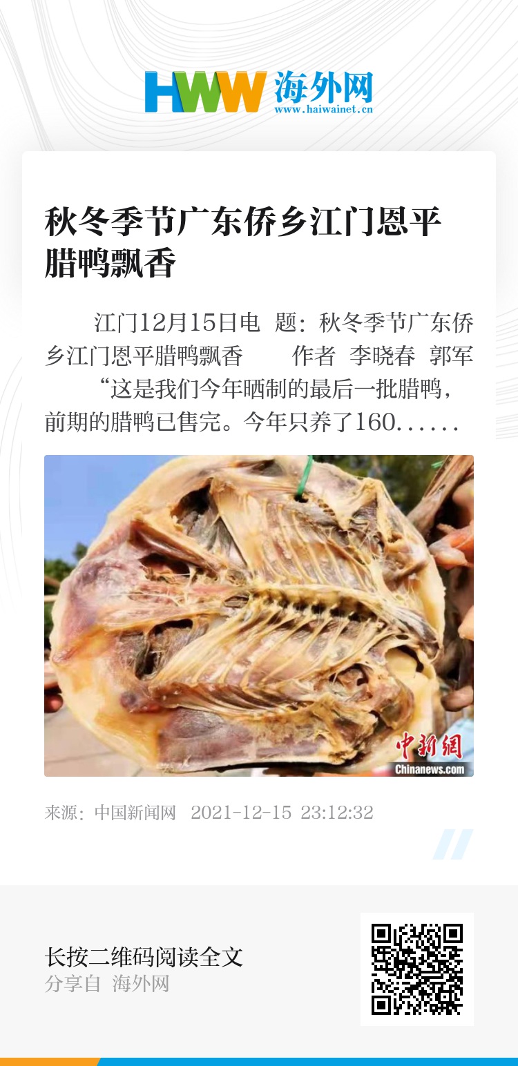 中新网江门12月15日电 题:秋冬季节广东侨乡江门恩平腊鸭飘香