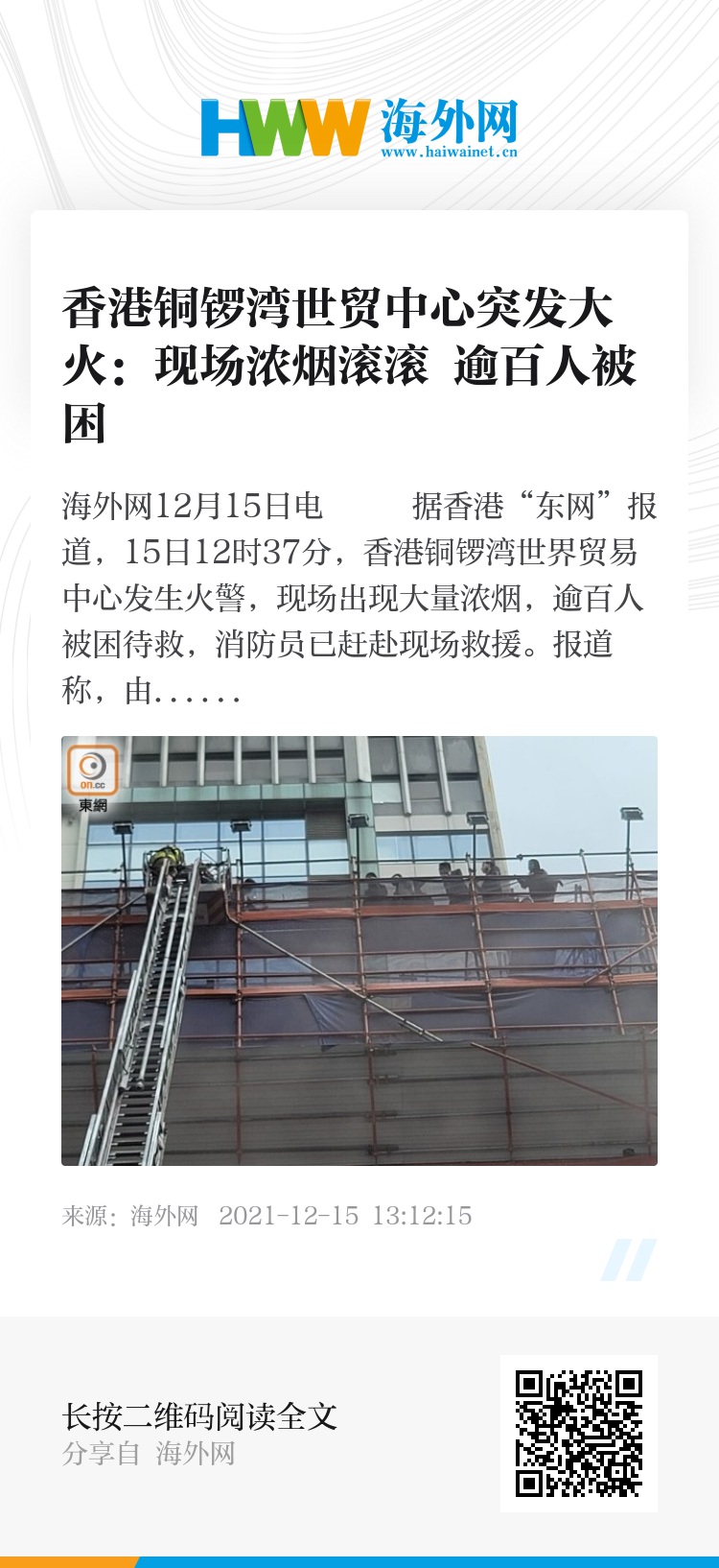 海外网12月15日电 据香港“东网”报道,15日12时37分,香港铜锣湾世界贸易中心发生火警,现场出现大量浓烟,逾百人被困待救,消防员已赶赴现场救援。