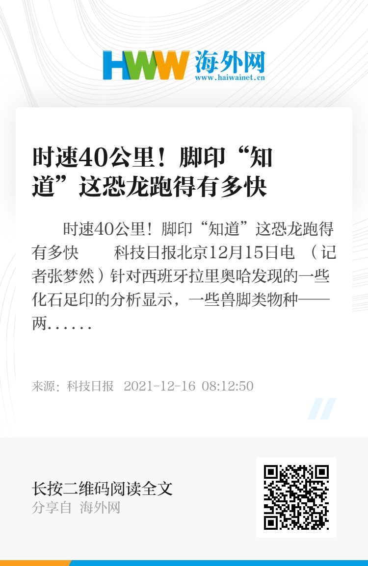 科技日报北京12月15日电 (记者张梦然)针对西班牙拉里奥哈发现的一些化石足印的分析显示,一些兽脚类物种——两足行走的捕食性恐龙,能达到每小时45公里的奔跑速度。这一古生物学研究结果近日发表在自然科研旗下《科学报告》上,这是迄今计算出的兽脚类恐龙最快的奔跑速度之一。