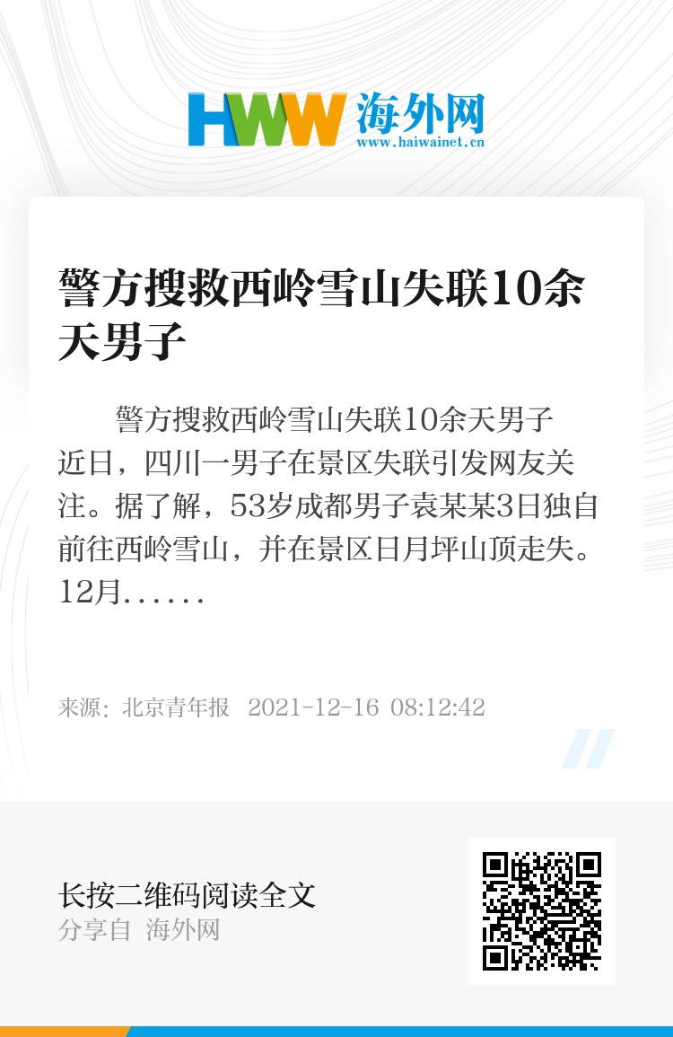 近日,四川一男子在景区失联引发网友关注。据了解,53岁成都男子袁某某3日独自前往西岭雪山,并在景区日月坪山顶走失。12月15日,北京青年报记者从当地警方处获悉,工作人员已经上山搜救,具体情况尚不清楚。