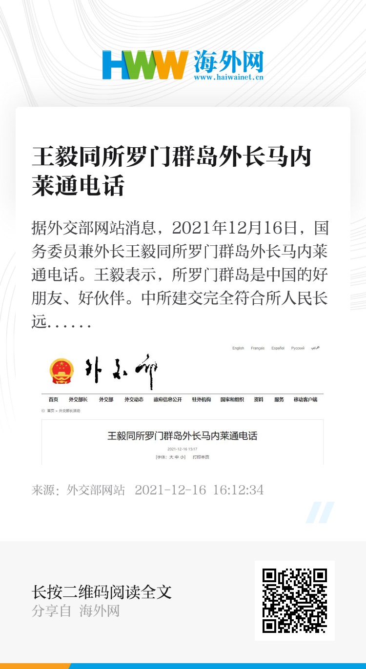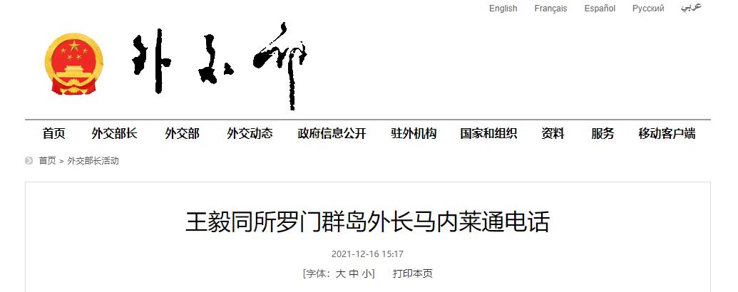 据外交部网站消息,2021年12月16日,国务委员兼外长王毅同所罗门群岛外长马内莱通电话。