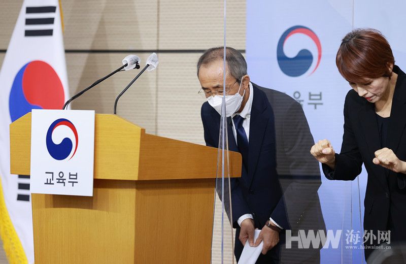 据韩联社2021年12月15日报道,韩国教育课程评价院院长姜泰重当天在政府世宗办公大楼举行记者会,就2022年度高考科目之一——生命科学2有一考题出错一事道歉并宣布引咎辞职。首尔行政法院当天就92名高考生针对评价院提起的生命科学2考题出错案作出判决,裁定原告胜诉,要求评价院取消对题目中原“正确答案”的决定。(图:澎湃影像)