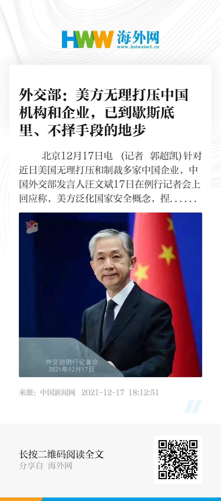 中新网北京12月17日电 (记者 郭超凯)针对近日美国无理打压和制裁多家中国企业,中国外交部发言人汪文斌17日在例行记者会上回应称,美方泛化国家安全概念,捏造各种借口,滥用出口管制措施,无理打压中国机构和企业,已经到了歇斯底里、不择手段的地步。