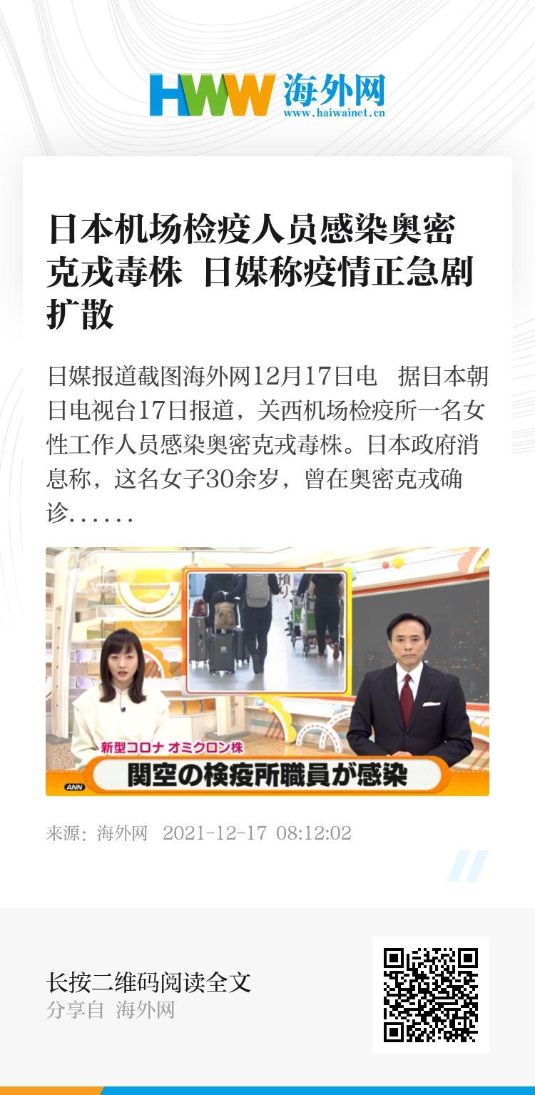 海外网12月17日电 据日本朝日电视台17日报道,关西机场检疫所一名女性工作人员感染奥密克戎毒株。