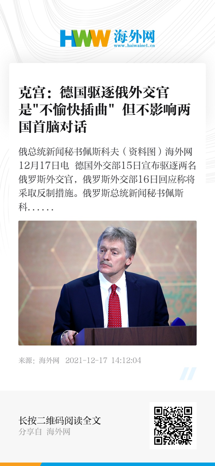 海外网12月17日电 德国外交部15日宣布驱逐两名俄罗斯外交官,俄罗斯外交部16日回应称将采取反制措施。俄罗斯总统新闻秘书佩斯科夫16日对媒体表示,驱逐外交官是俄德关系中一段“不愉快的插曲”,但不会影响俄罗斯总统普京和德国新总理朔尔茨之间建立对话的前景。