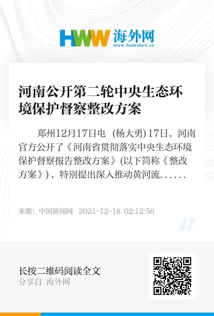中新网郑州12月17日电 (杨大勇)17日,河南官方公开了《河南省贯彻落实中央生态环境保护督察报告整改方案》(以下简称《整改方案》),特别提出深入推动黄河流域生态保护和高质量发展,努力提升生态文明建设和生态环境保护水平,对督察整改工作中发现的表面整改、虚假整改、敷衍整改问题,严肃追究有关人员责任。