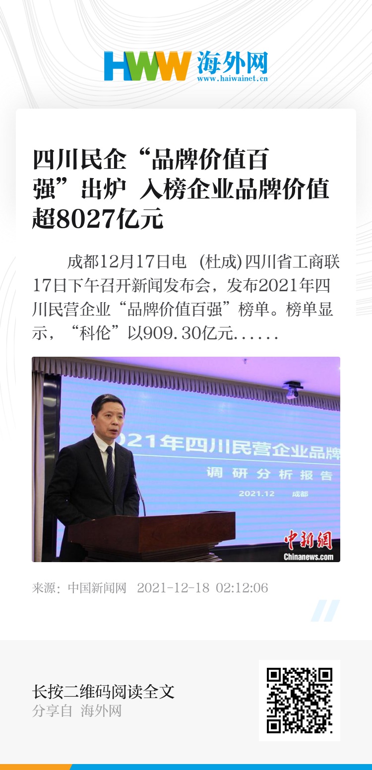 中新网成都12月17日电 (杜成)四川省工商联17日下午召开新闻发布会,发布2021年四川民营企业“品牌价值百强”榜单。榜单显示,“科伦”以909.30亿元品牌价值位居榜首,“蓝剑”、“六和”分别以754.70亿元、524.79亿元位列第二和第三位。