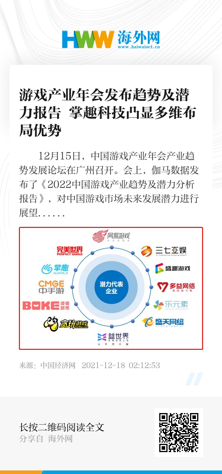 12月15日,中国游戏产业年会产业趋势发展论坛在广州召开。会上,伽马数据发布了《2022中国游戏产业趋势及潜力分析报告》,对中国游戏市场未来发展潜力进行展望,并对最具代表性的中国游戏产业潜力企业做了细致分析。其中,掌趣科技因在多个细分品类以及境外市场发展的出色表现,成为中国游戏产业潜力代表企业,再次凸显掌趣科技多维布局优势。