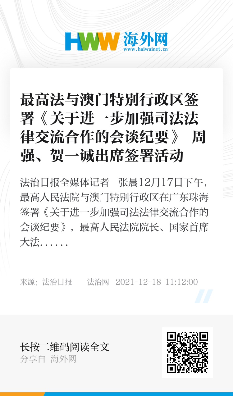 12月17日下午,最高人民法院与澳门特别行政区在广东珠海签署《关于进一步加强司法法律交流合作的会谈纪要》,最高人民法院院长、国家首席大法官周强和澳门特别行政区行政长官贺一诚出席签署活动。最高人民法院副院长、二级大法官杨万明和澳门特别行政区政府行政法务司司长张永春分别代表双方签署《会谈纪要》。