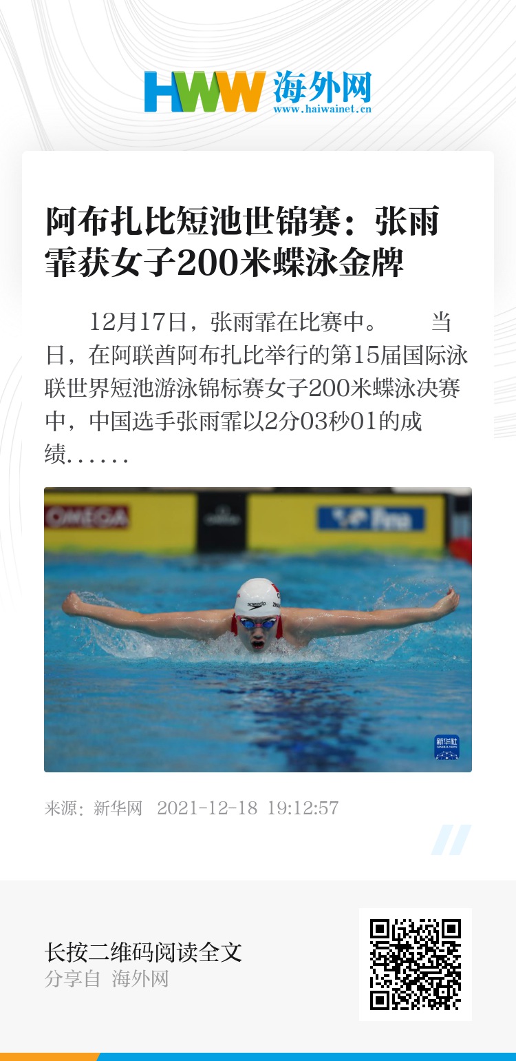 当日,在阿联酋阿布扎比举行的第15届国际泳联世界短池游泳锦标赛女子200米蝶泳决赛中,中国选手张雨霏以2分03秒01的成绩获得金牌。