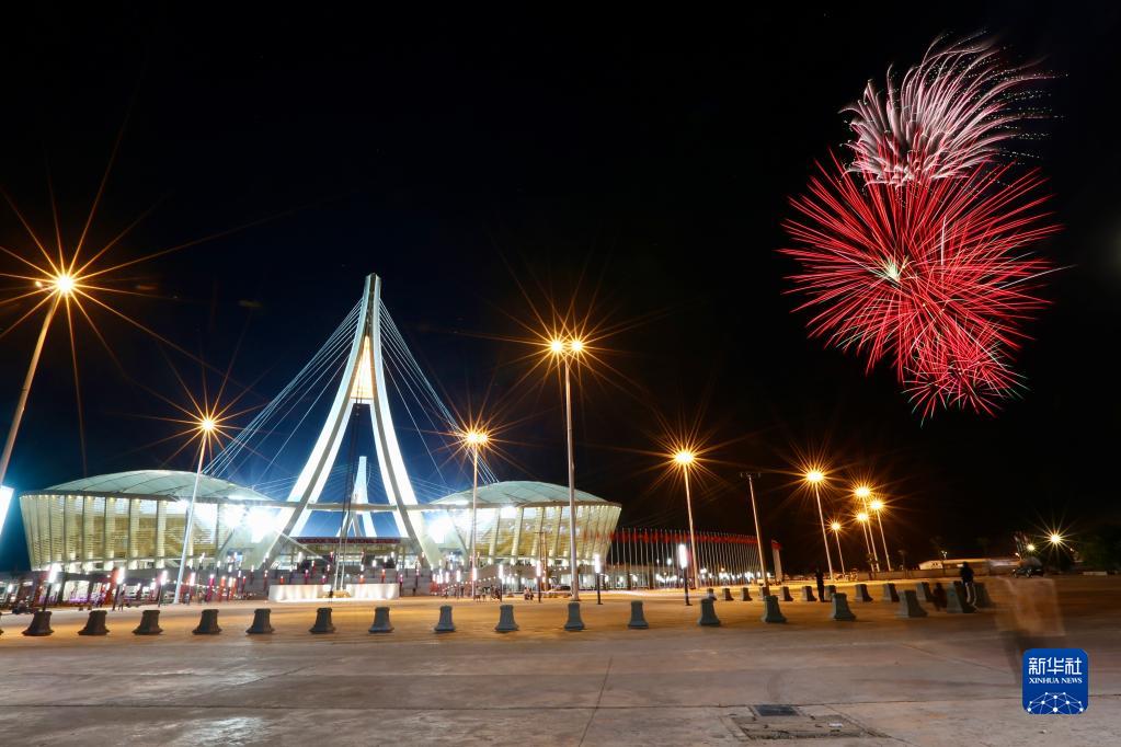 12月18日,焰火在柬埔寨金边的柬埔寨国家体育场上空燃放。新华社发(索万纳拉摄)