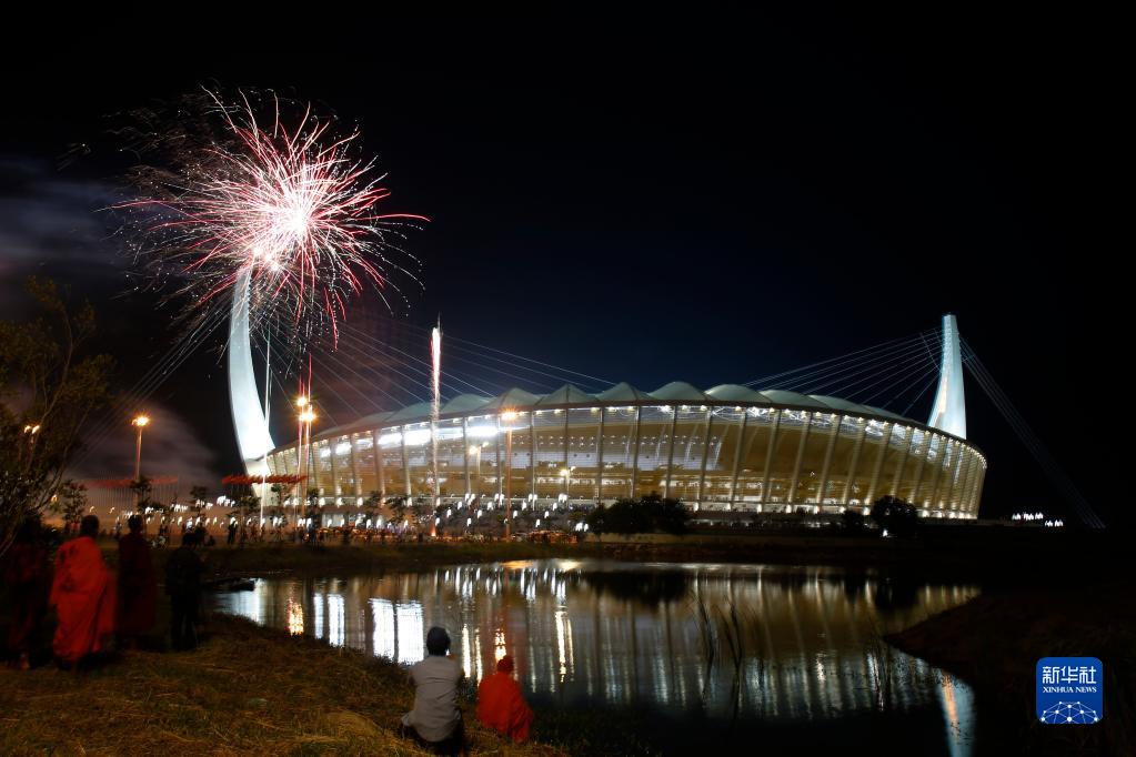 12月18日,焰火在柬埔寨金边的柬埔寨国家体育场上空燃放。新华社发(索万纳拉摄)