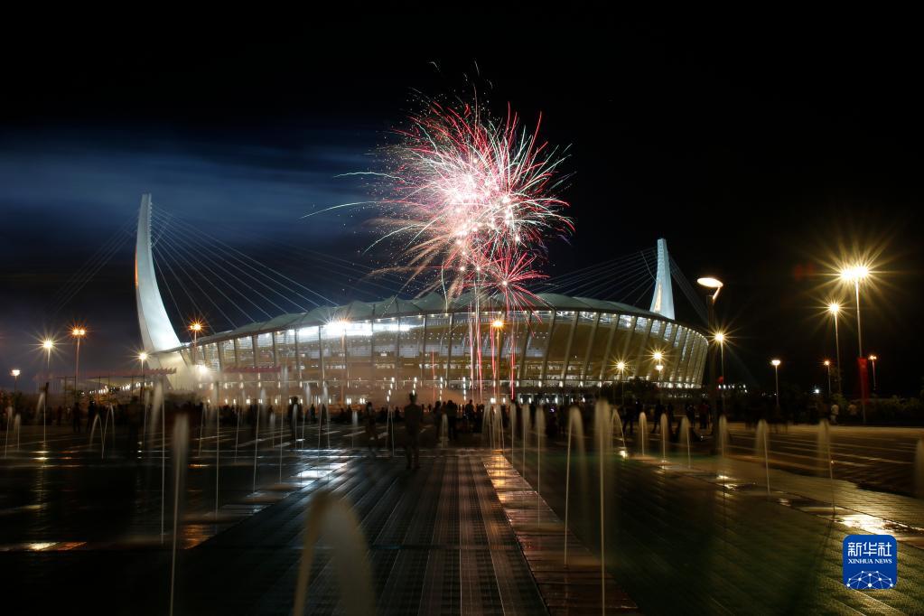 12月18日,焰火在柬埔寨金边的柬埔寨国家体育场上空燃放。新华社发(索万纳拉摄)
