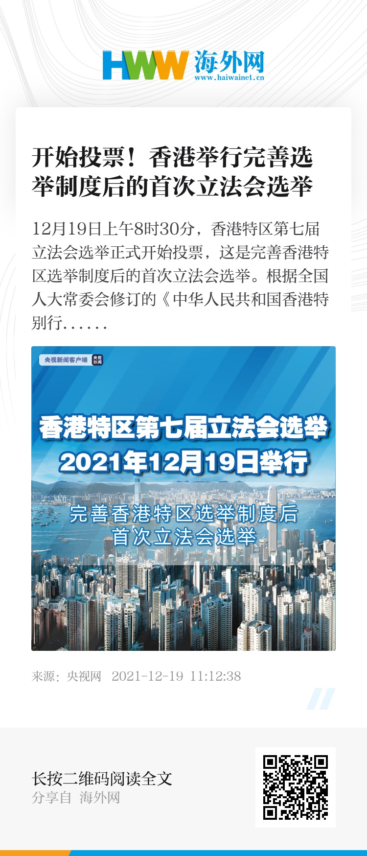 12月19日上午8时30分,香港特区第七届立法会选举正式开始投票,这是完善香港特区选举制度后的首次立法会选举。根据全国人大常委会修订的《中华人民共和国香港特别行政区基本法附件二香港特别行政区立法会的产生办法和表决程序》以及香港特区有关法规,新一届香港特区立法会将由90名议员组成,其中包括选举委员会选举的议员40人、功能团体选举的议员30人和分区直接选举的议员20人。