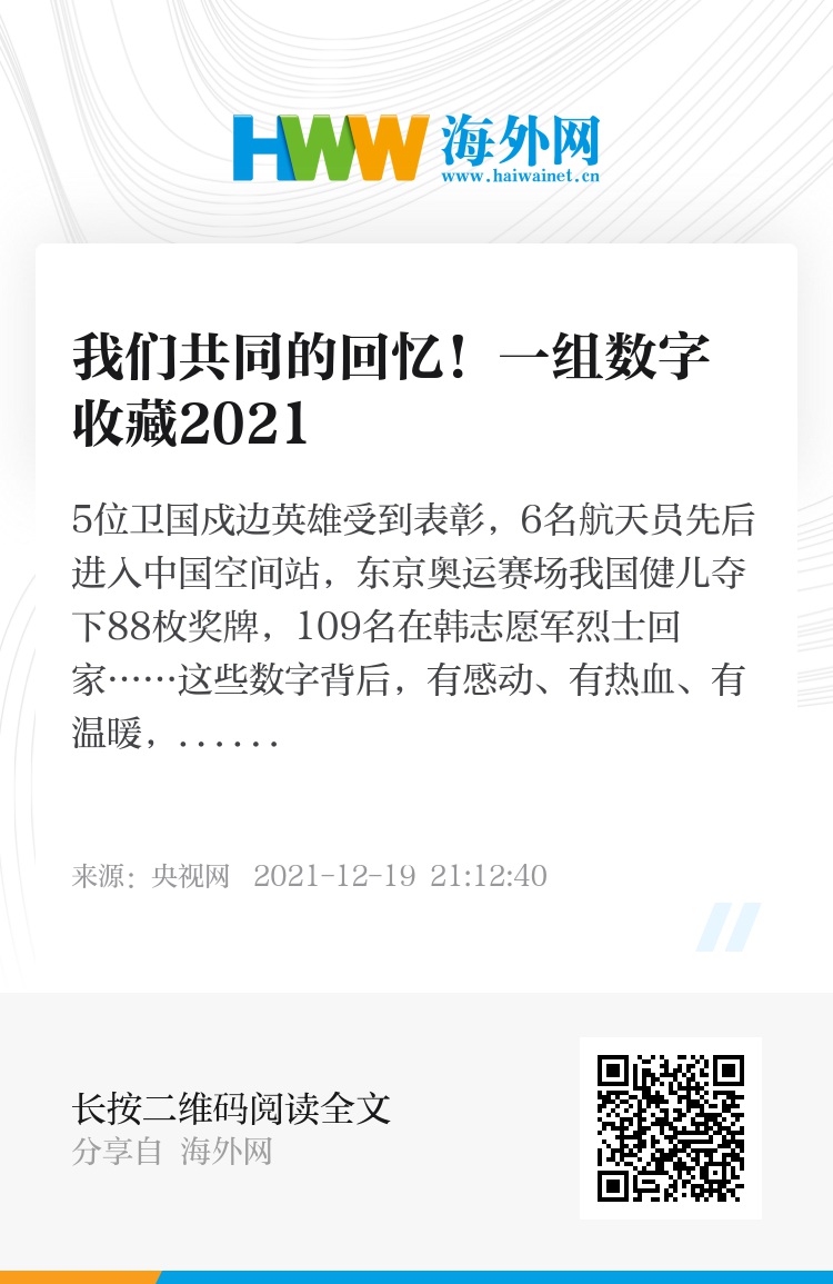 5位卫国戍边英雄受到表彰,6名航天员先后进入中国空间站,东京奥运赛场我国健儿夺下88枚奖牌,109名在韩志愿军烈士回家……这些数字背后,有感动、有热血、有温暖,藏着2021我们的共同记忆↓这一年哪些数字让你印象深刻?