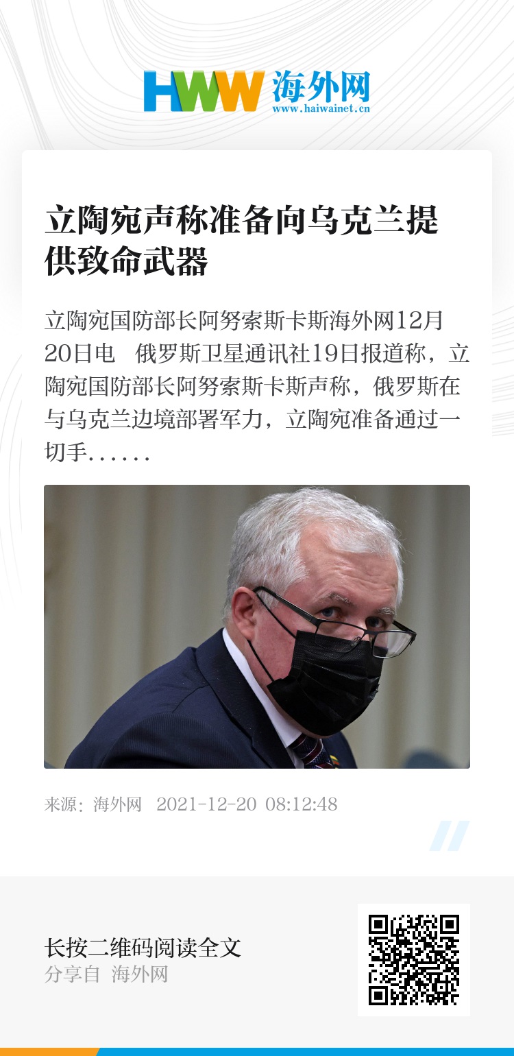 海外网12月20日电 俄罗斯卫星通讯社19日报道称,立陶宛国防部长阿努索斯卡斯声称,俄罗斯在与乌克兰边境部署军力,立陶宛准备通过一切手段支持乌克兰,包括提供致命武器。