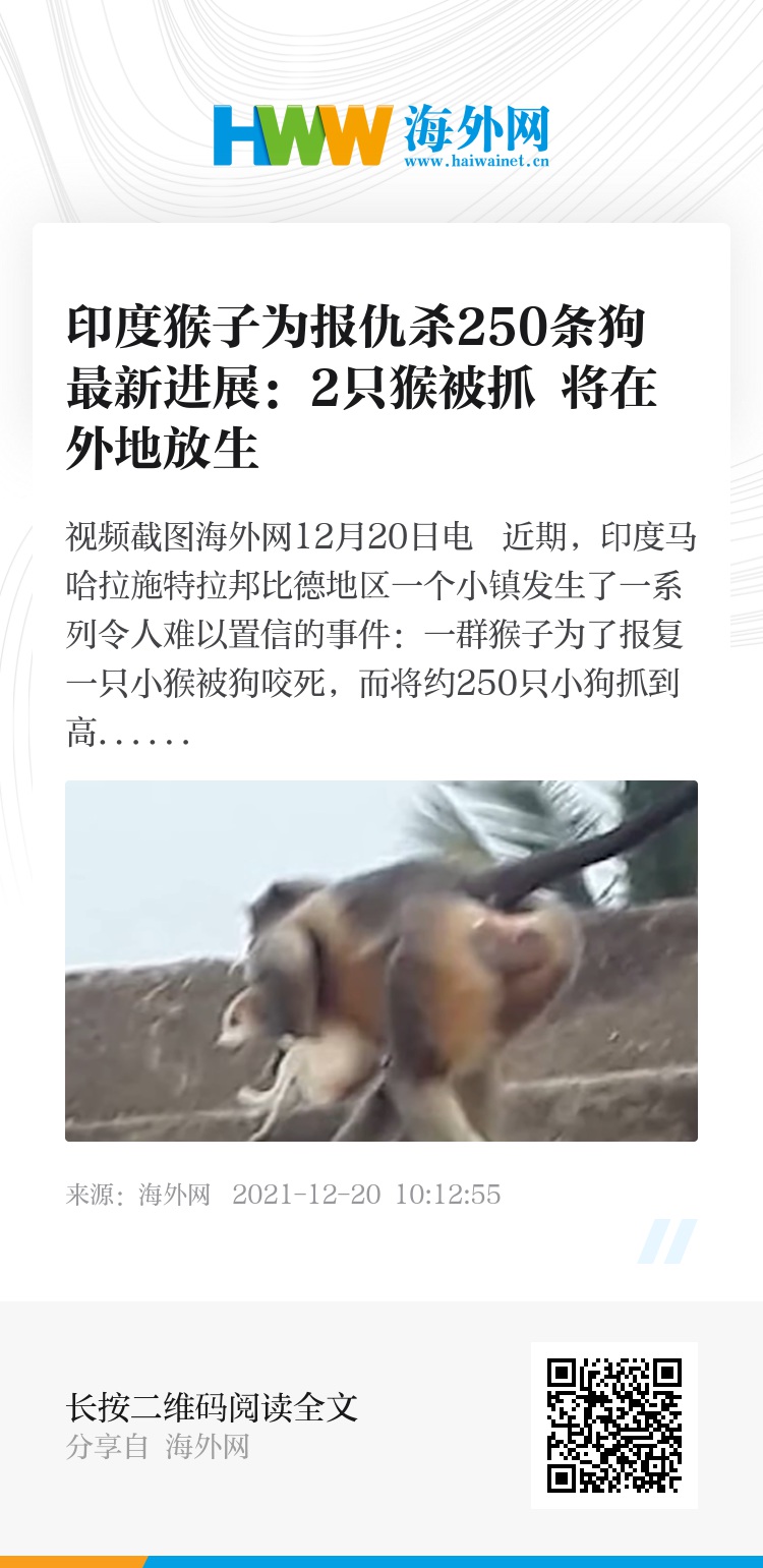 海外网12月20日电 近期,印度马哈拉施特拉邦比德地区一个小镇发生了一系列令人难以置信的事件:一群猴子为了报复一只小猴被狗咬死,而将约250只小狗抓到高处,随后扔下杀死。据印媒最新消息,目前当地林业部门已经抓到了两只参与杀害幼犬的猴子,它们将被带到森林里释放。