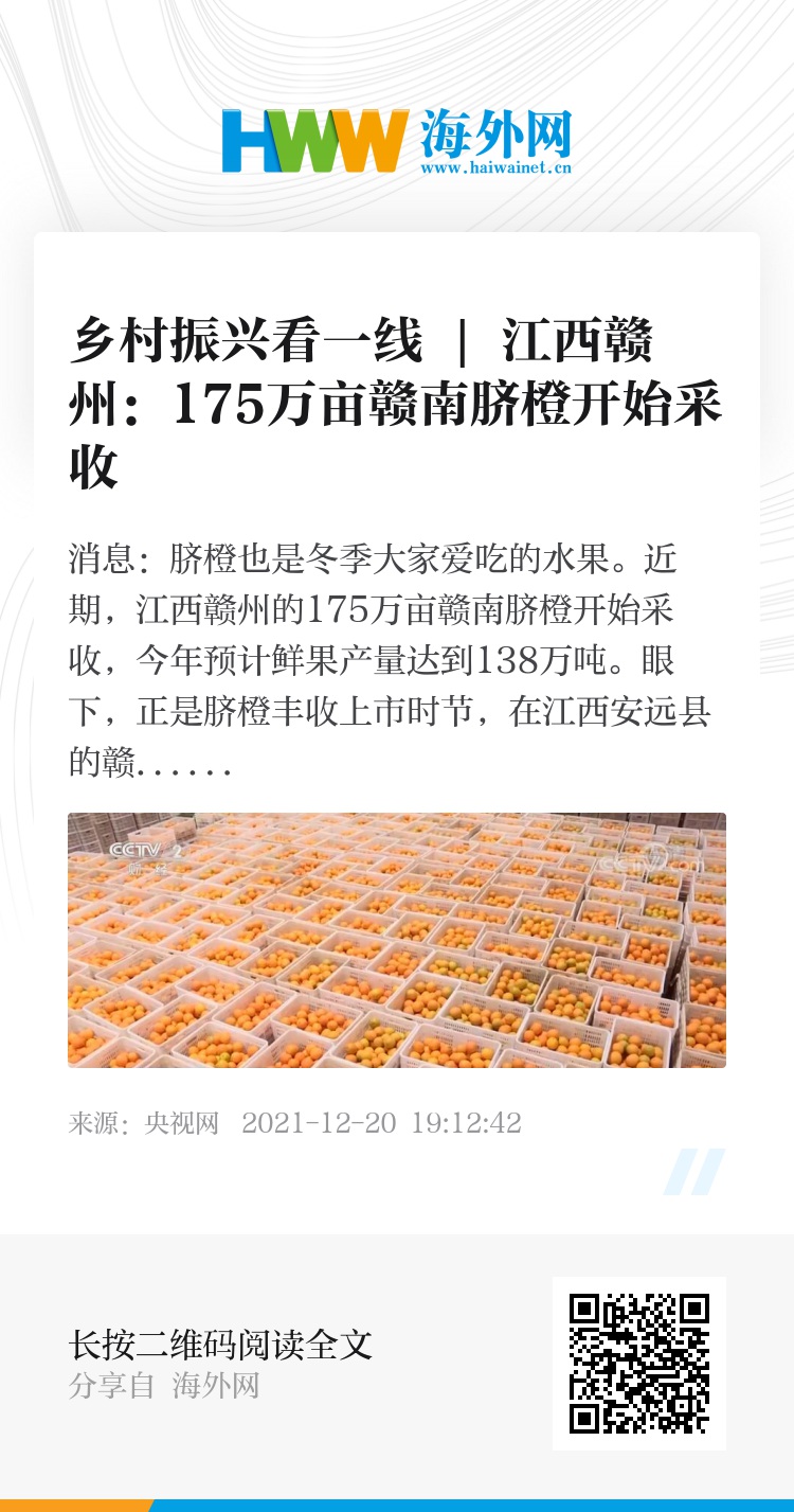 央视网消息:脐橙也是冬季大家爱吃的水果。近期,江西赣州的175万亩赣南脐橙开始采收,今年预计鲜果产量达到138万吨。