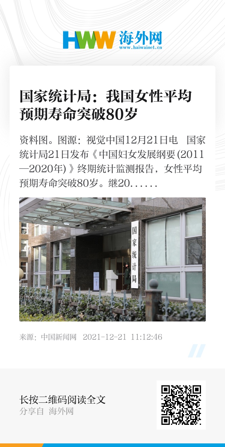 中新网12月21日电 国家统计局21日发布《中国妇女发展纲要(2011—2020年)》终期统计监测报告,女性平均预期寿命突破80岁。继2000年我国进入长寿国家行列之后,我国人均预期寿命持续提高,其中,女性人均预期寿命从2010年的77.37岁提高到2015年的79.43岁,2020年进一步提高到80.88岁。
