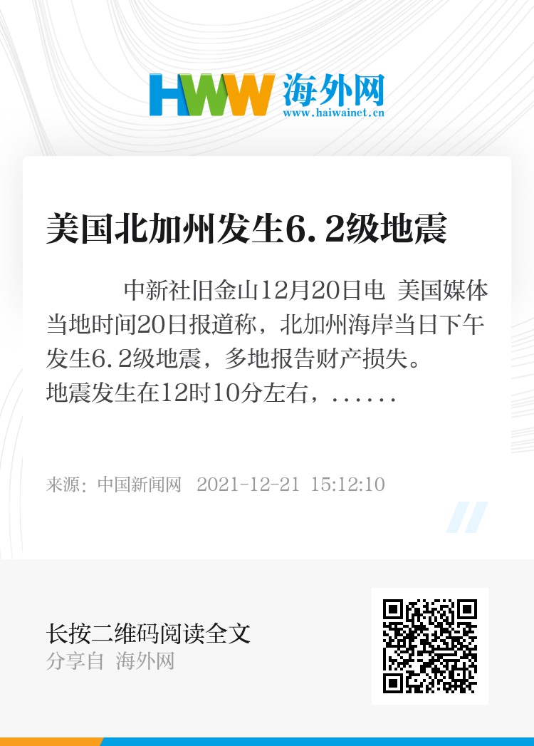 中新社旧金山12月20日电 美国媒体当地时间20日报道称,北加州海岸当日下午发生6.2级地震,多地报告财产损失。