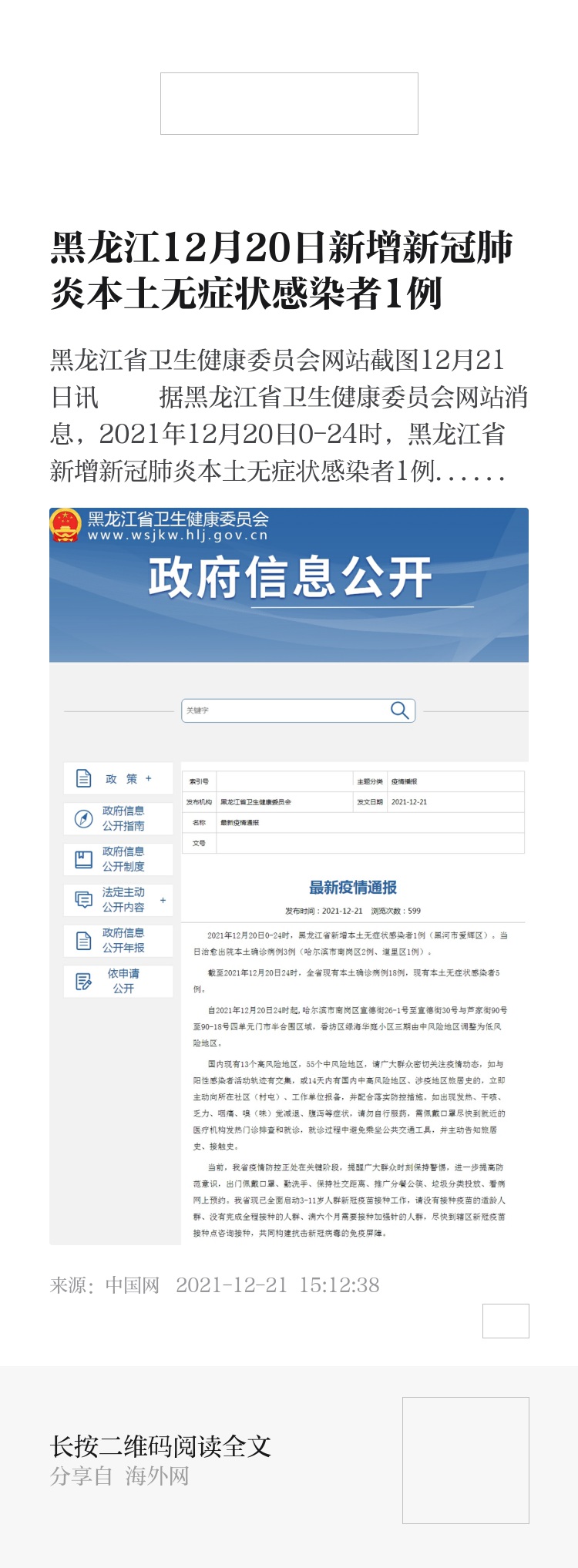 中国网12月21日讯 据黑龙江省卫生健康委员会网站消息,2021年12月20日0-24时,黑龙江省新增新冠肺炎本土无症状感染者1例(黑河市爱辉区)。当日治愈出院本土确诊病例3例(哈尔滨市南岗区2例、道里区1例)。