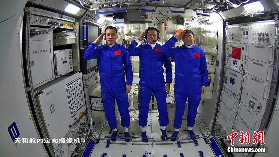 敬礼!6月17日进驻天和核心舱的航天员向全国人民敬礼致意,这是中国人首次进入自己的空间站。图片来源:视觉中国
