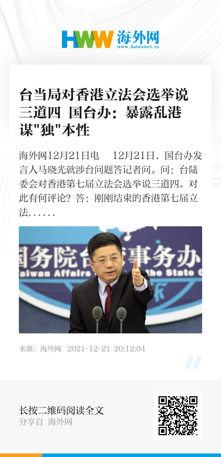 海外网12月21日电 12月21日,国台办发言人马晓光就涉台问题答记者问。