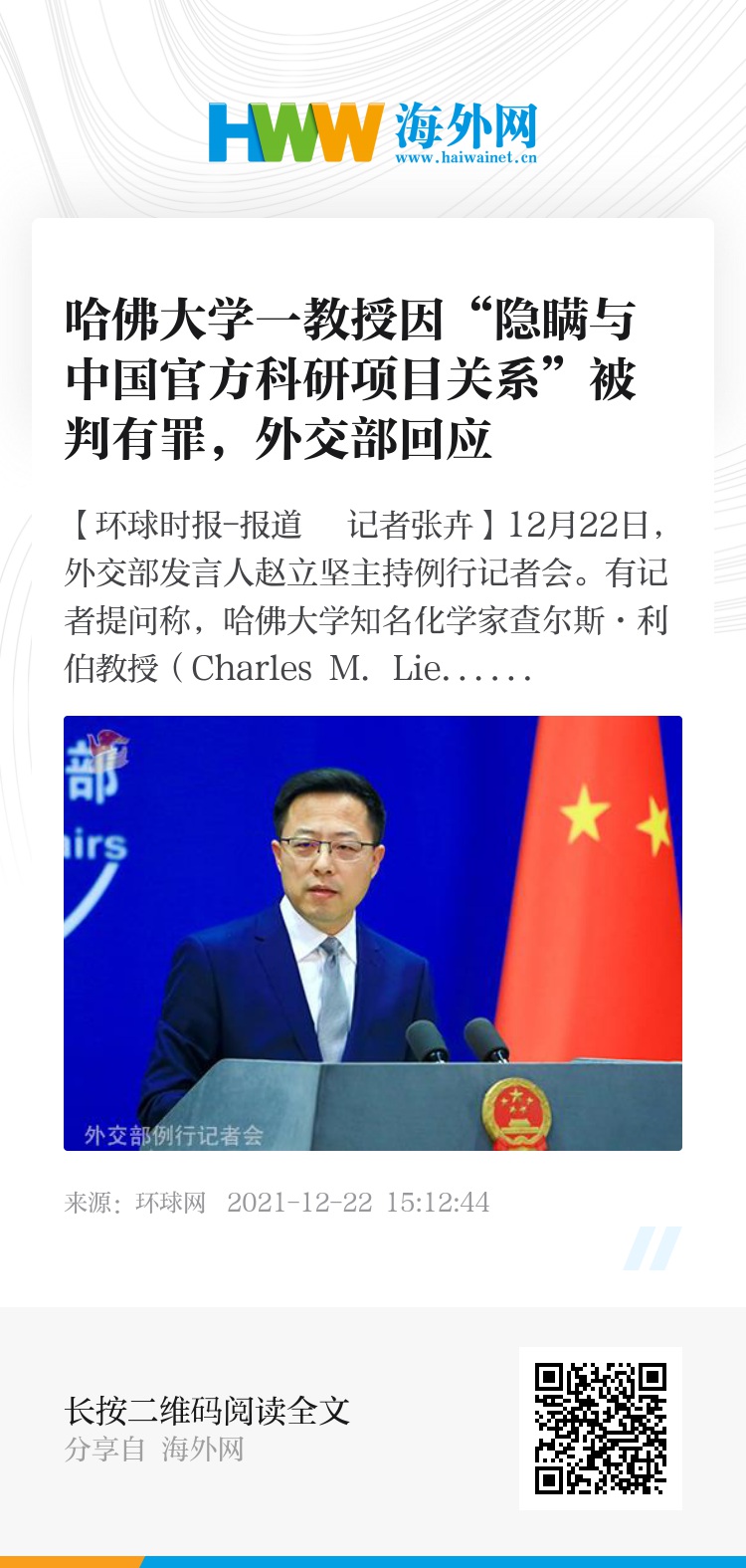 【环球时报-环球网报道 记者张卉】12月22日,外交部发言人赵立坚主持例行记者会。有记者提问称,哈佛大学知名化学家查尔斯·利伯教授(Charles M. Lieber)因隐瞒与中国官方科研项目的关系被判有罪。对此,赵立坚表示,我不了解你提到的具体情况,我也不会对美方司法个案置评。