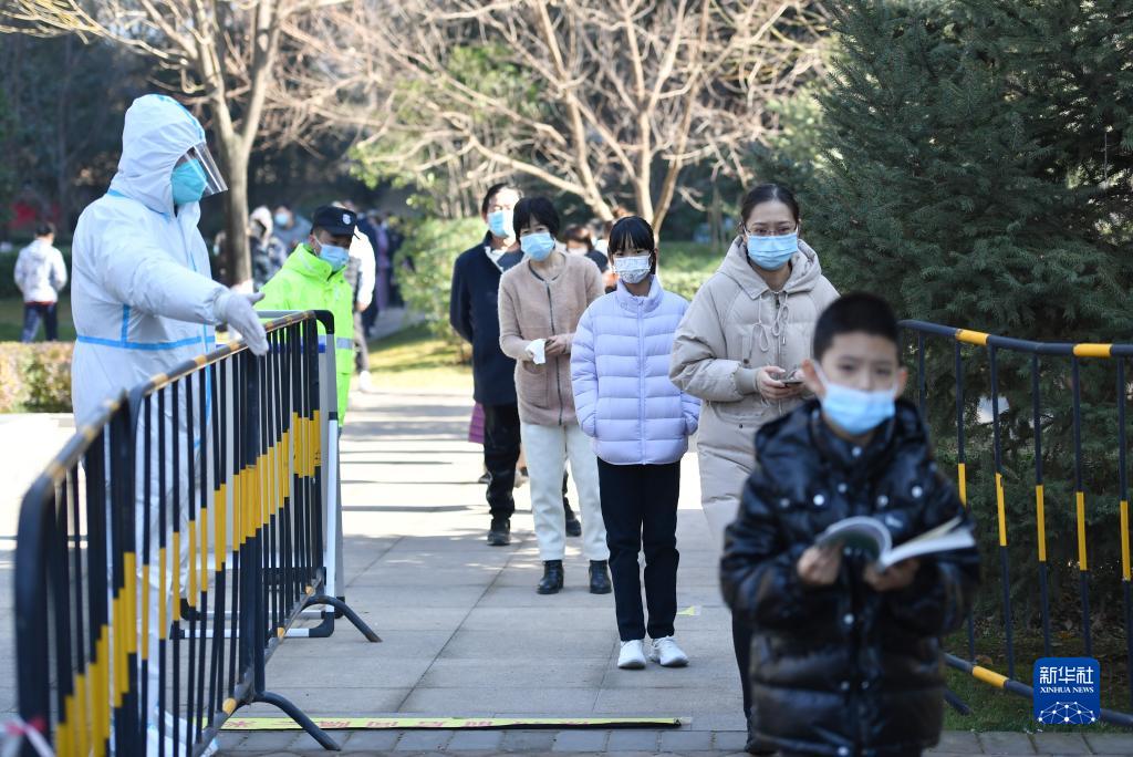 12月21日,在封控管理的西安曲江风景线小区,居民排队等待核酸检测。当日,西安全面展开新一轮全员核酸检测。新华社记者 邵瑞 摄