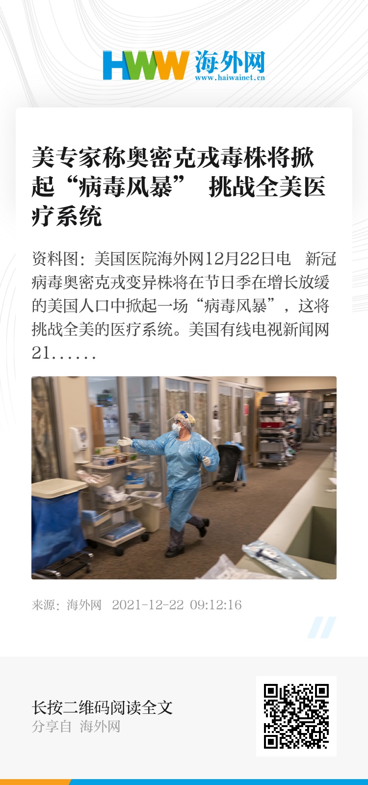 海外网12月22日电 新冠病毒奥密克戎变异株将在节日季在增长放缓的美国人口中掀起一场“病毒风暴”,这将挑战全美的医疗系统。