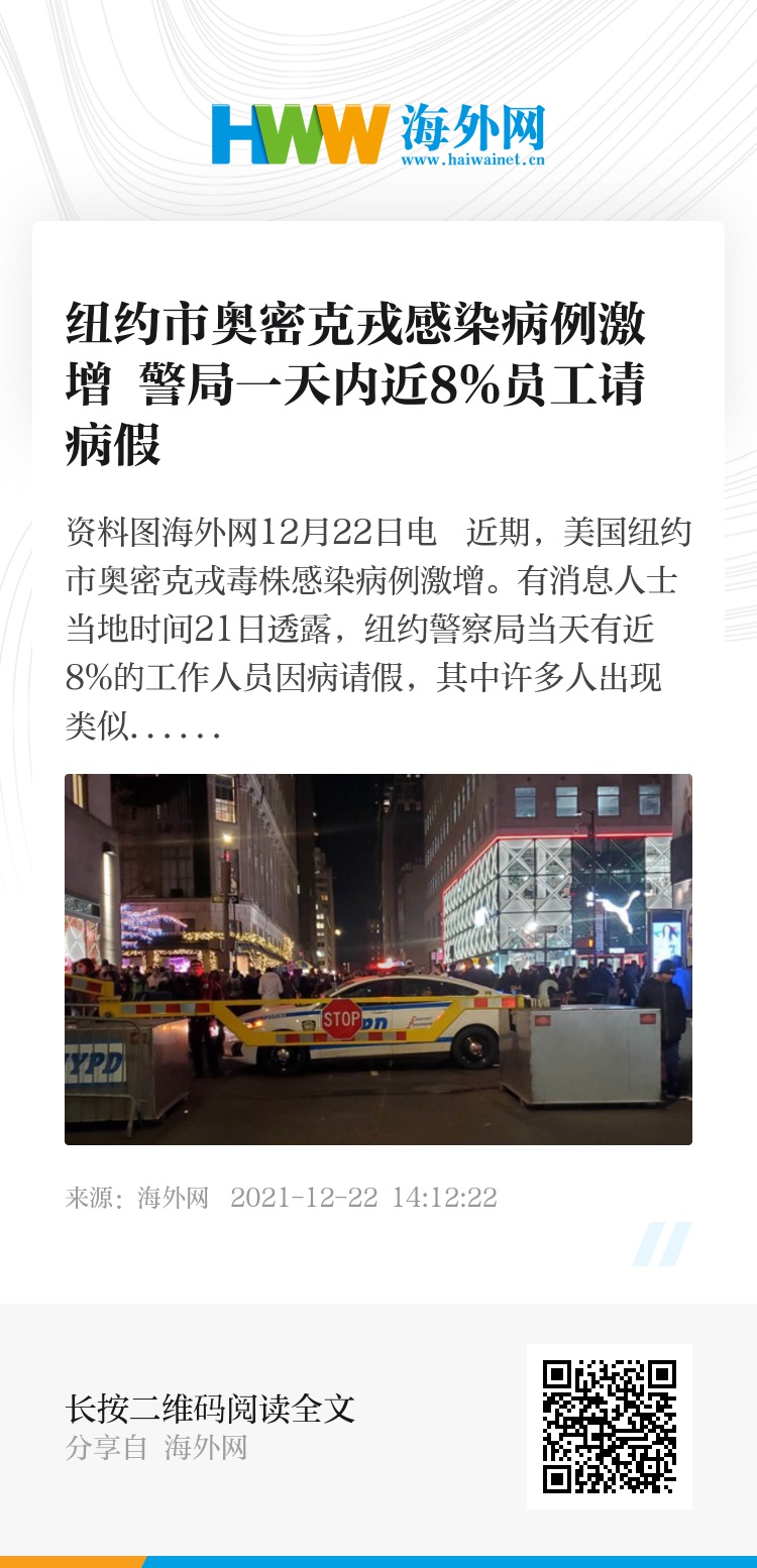 海外网12月22日电 近期,美国纽约市奥密克戎毒株感染病例激增。有消息人士当地时间21日透露,纽约警察局当天有近8%的工作人员因病请假,其中许多人出现类似流感的症状。