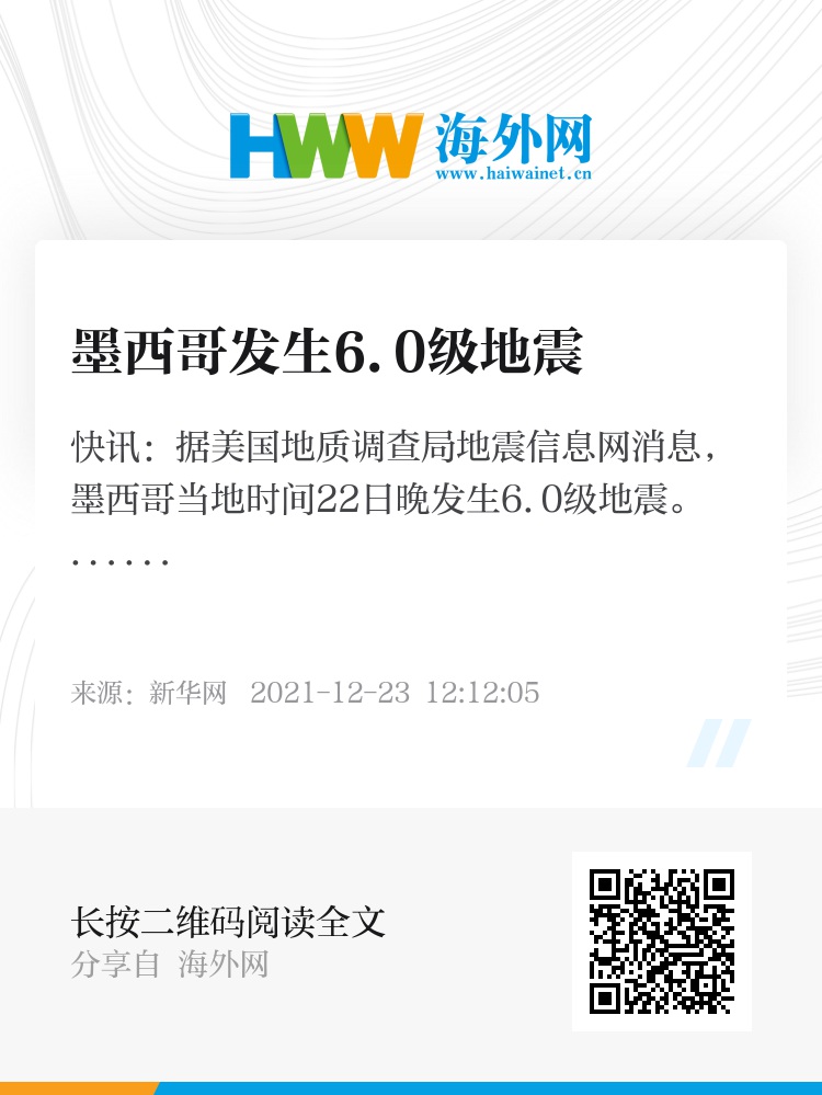 新华社快讯:据美国地质调查局地震信息网消息,墨西哥当地时间22日晚发生6.0级地震。