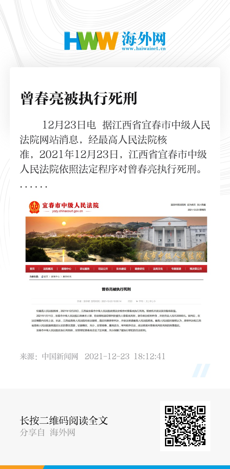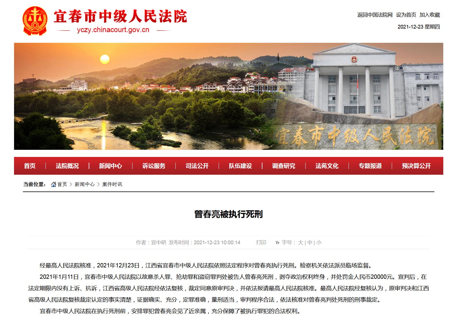 中新网12月23日电 据江西省宜春市中级人民法院网站消息,经最高人民法院核准,2021年12月23日,江西省宜春市中级人民法院依照法定程序对曾春亮执行死刑。检察机关依法派员临场监督。