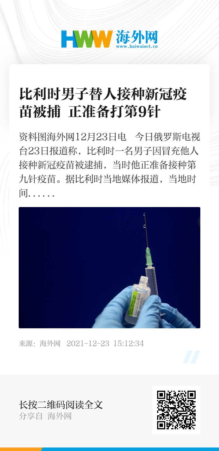 海外网12月23日电 今日俄罗斯电视台23日报道称,比利时一名男子因冒充他人接种新冠疫苗被逮捕,当时他正准备接种第九针疫苗。
