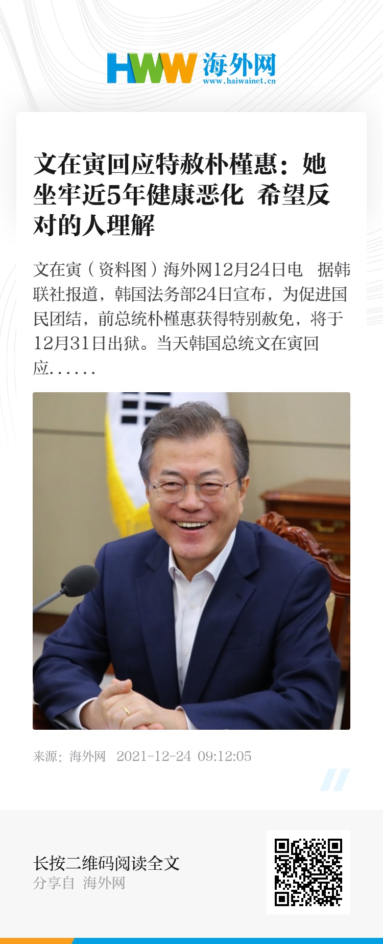 海外网12月24日电 据韩联社报道,韩国法务部24日宣布,为促进国民团结,前总统朴槿惠获得特别赦免,将于12月31日出狱。当天韩国总统文在寅回应称,希望此举能够成为开启团结、和解新时代的契机,并称朴槿惠入狱近5年健康状况大幅恶化,希望反对者理解。