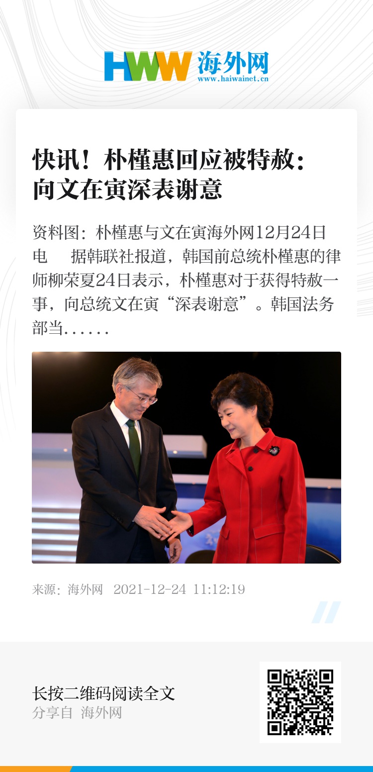 韩国法务部当天宣布,为促进国民团结,朴槿惠获得特赦,将于12月31日出狱。文在寅表示,希望此举能够成为开启团结、和解新时代的契机,并称朴槿惠入狱近5年健康状况大幅恶化,希望反对者理解。