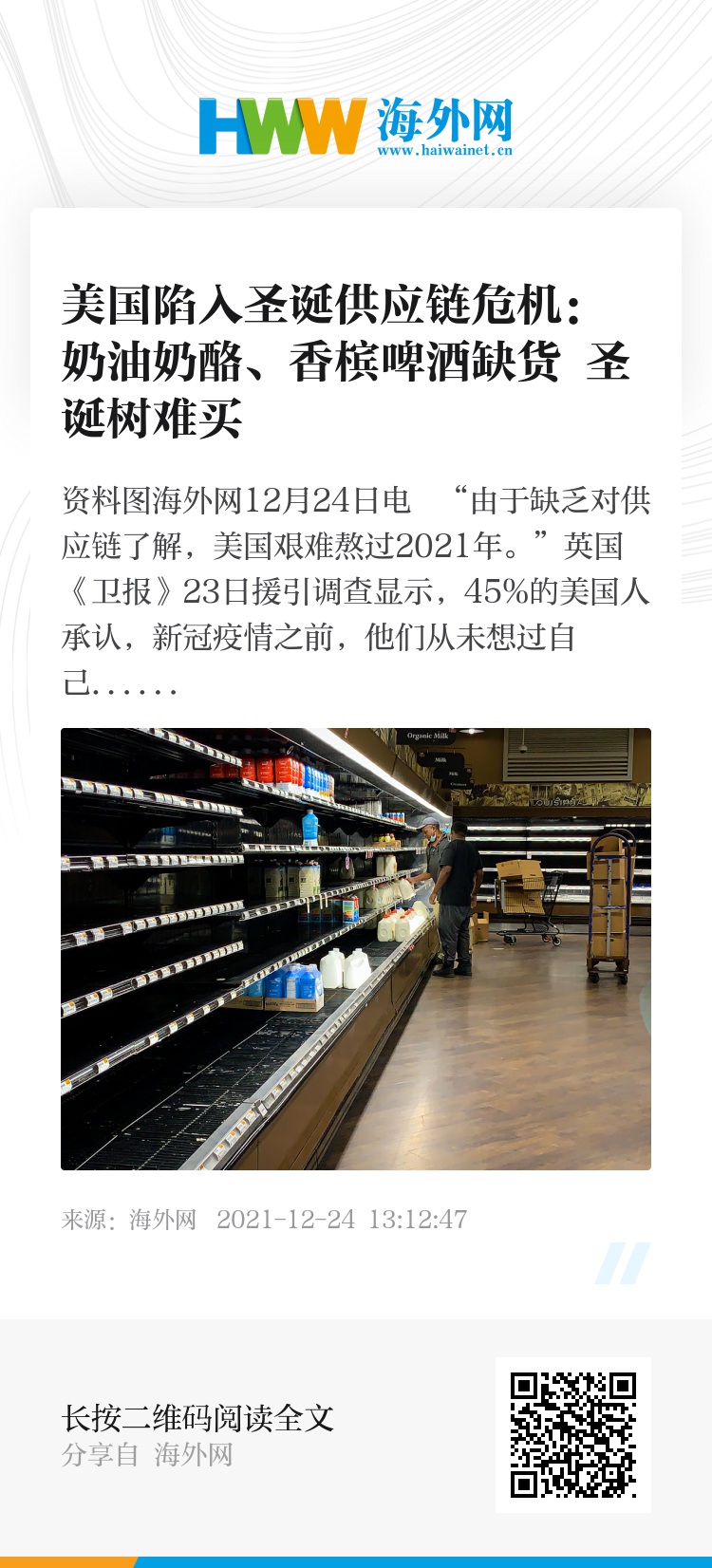 海外网12月24日电 “由于缺乏对供应链了解,美国艰难熬过2021年。”英国《卫报》23日援引调查显示,45%的美国人承认,新冠疫情之前,他们从未想过自己买到的商品是如何制造和交付的。《今日美国》也刊文称,2021年圣诞假期,美国大量商品出现短缺,如奶油奶酪、糖果零食及酒类饮品,甚至是圣诞树和节日装饰品。