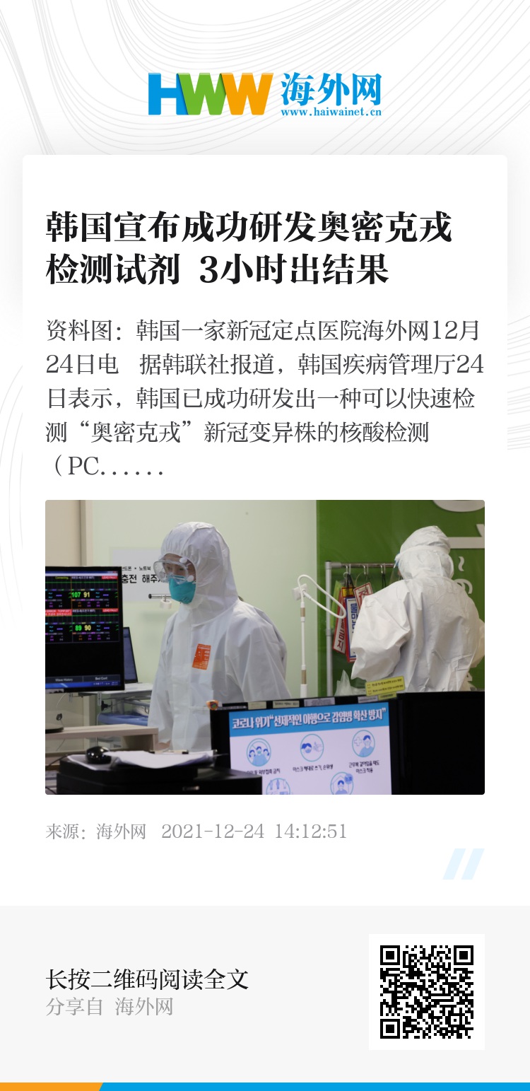 海外网12月24日电 据韩联社报道,韩国疾病管理厅24日表示,韩国已成功研发出一种可以快速检测“奥密克戎”新冠变异株的核酸检测(PCR)试剂。