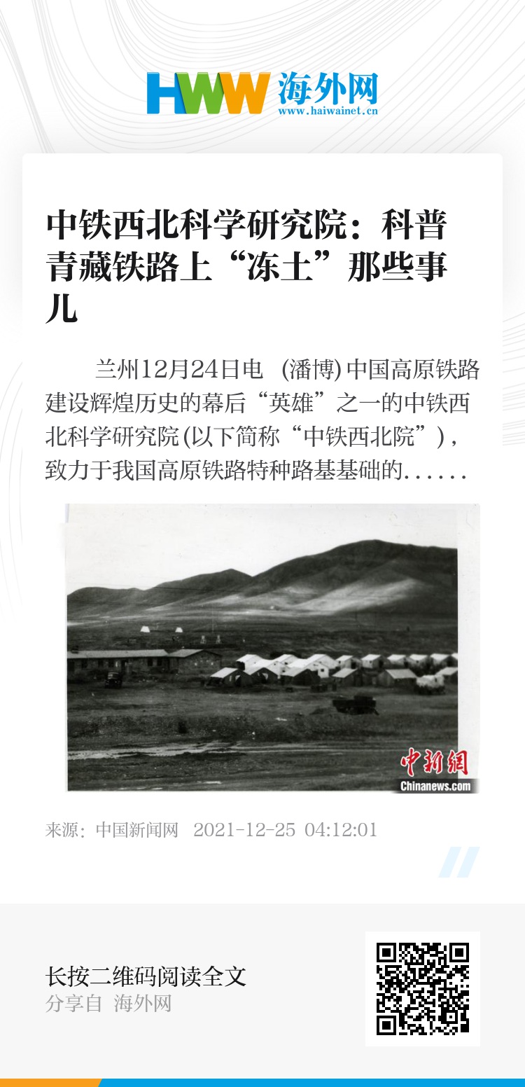 中新网兰州12月24日电 (潘博)中国高原铁路建设辉煌历史的幕后“英雄”之一的中铁西北科学研究院(以下简称“中铁西北院”),致力于我国高原铁路特种路基基础的科研与创新工作,为解决青藏铁路“冻土难题”,埋头苦干了六十年。