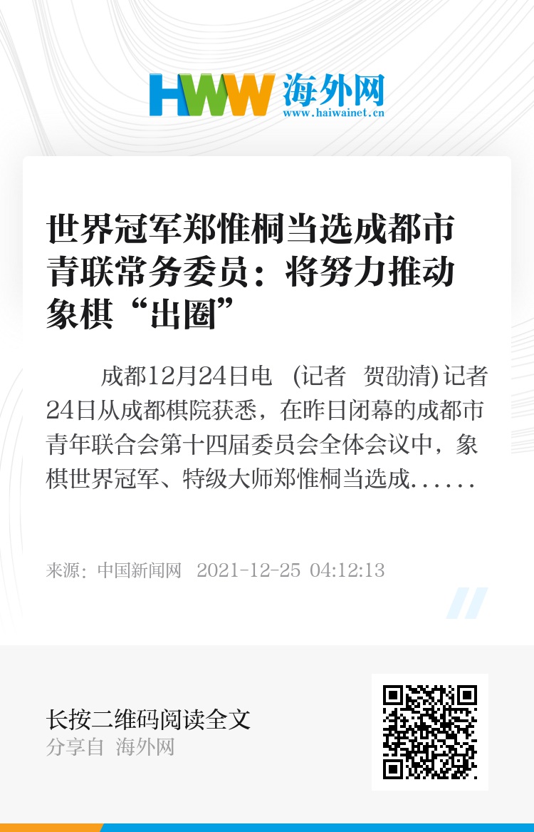 中新网成都12月24日电 (记者 贺劭清)记者24日从成都棋院获悉,在昨日闭幕的成都市青年联合会第十四届委员会全体会议中,象棋世界冠军、特级大师郑惟桐当选成都市青联十四届常务委员会委员。郑惟桐表示,象棋需要走出过去封闭的圈子,让更多人来了解象棋,自己今后将创造更多机会去服务青年,与青年做更多的交流,充分发挥象棋运动的体育和教育作用,进一步增强广大青年的文化自信。