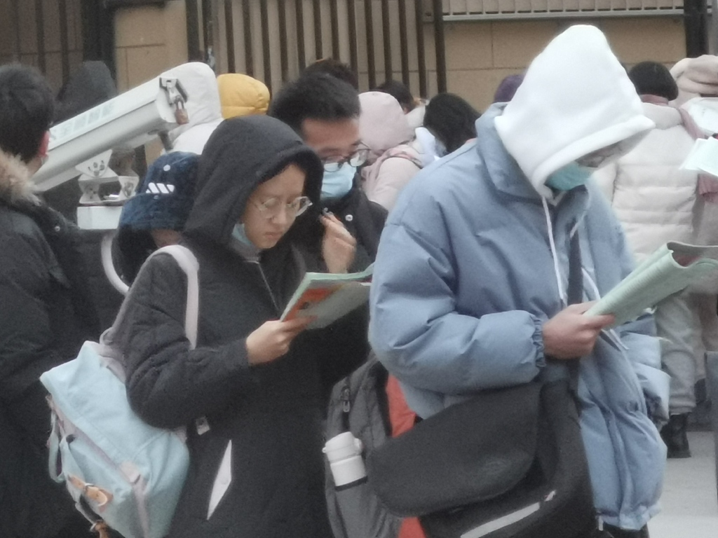 12月25日,石家庄第十二中学硕士研究生招生考试考点,考生在零下近10℃的寒风中等待入场。 图片作者:任全军/视觉中国