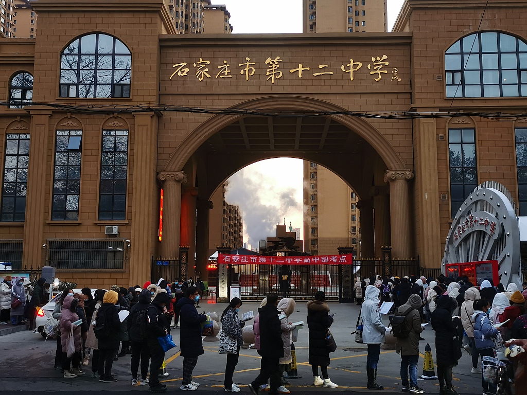 12月25日,石家庄第十二中学硕士研究生招生考试考点,考生在零下近10℃的寒风中等待入场。 图片作者:任全军/视觉中国