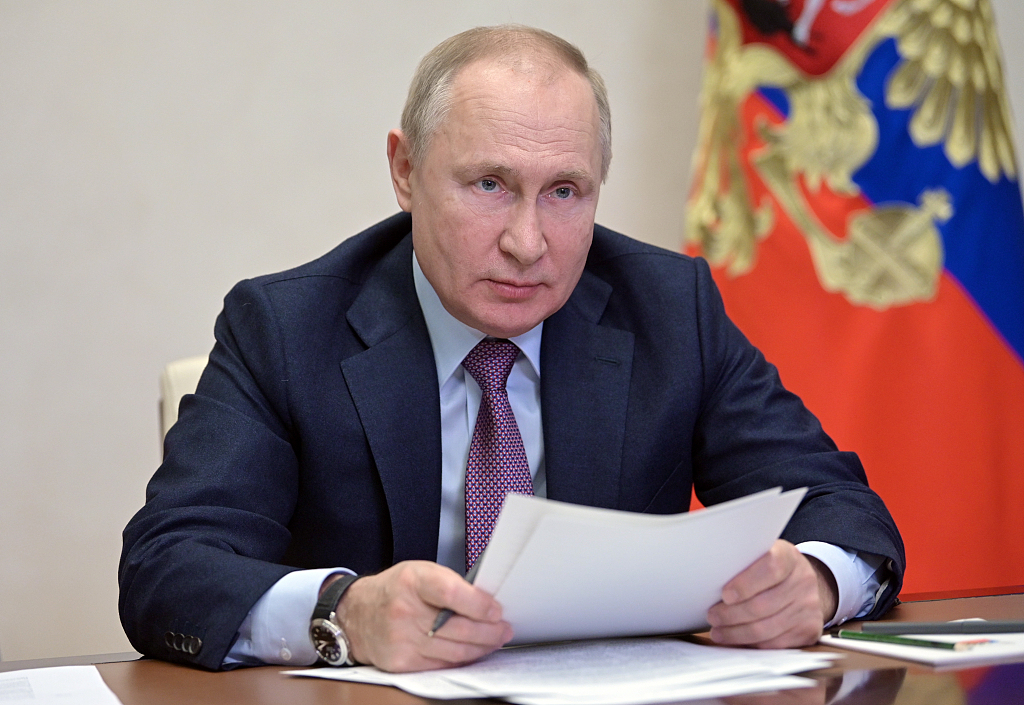 当地时间12月24日,俄罗斯莫斯科,俄罗斯总统普京出席视频会议,普京表示,24日凌晨俄罗斯进行了“锆石”高超音速导弹发射测试,试验取得成功。图片来源:视觉中国