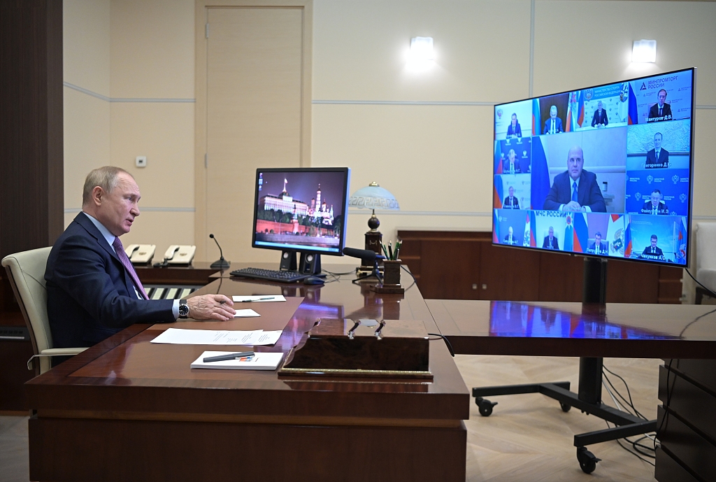 当地时间12月24日,俄罗斯莫斯科,俄罗斯总统普京出席视频会议,普京表示,24日凌晨俄罗斯进行了“锆石”高超音速导弹发射测试,试验取得成功。图片来源:视觉中国