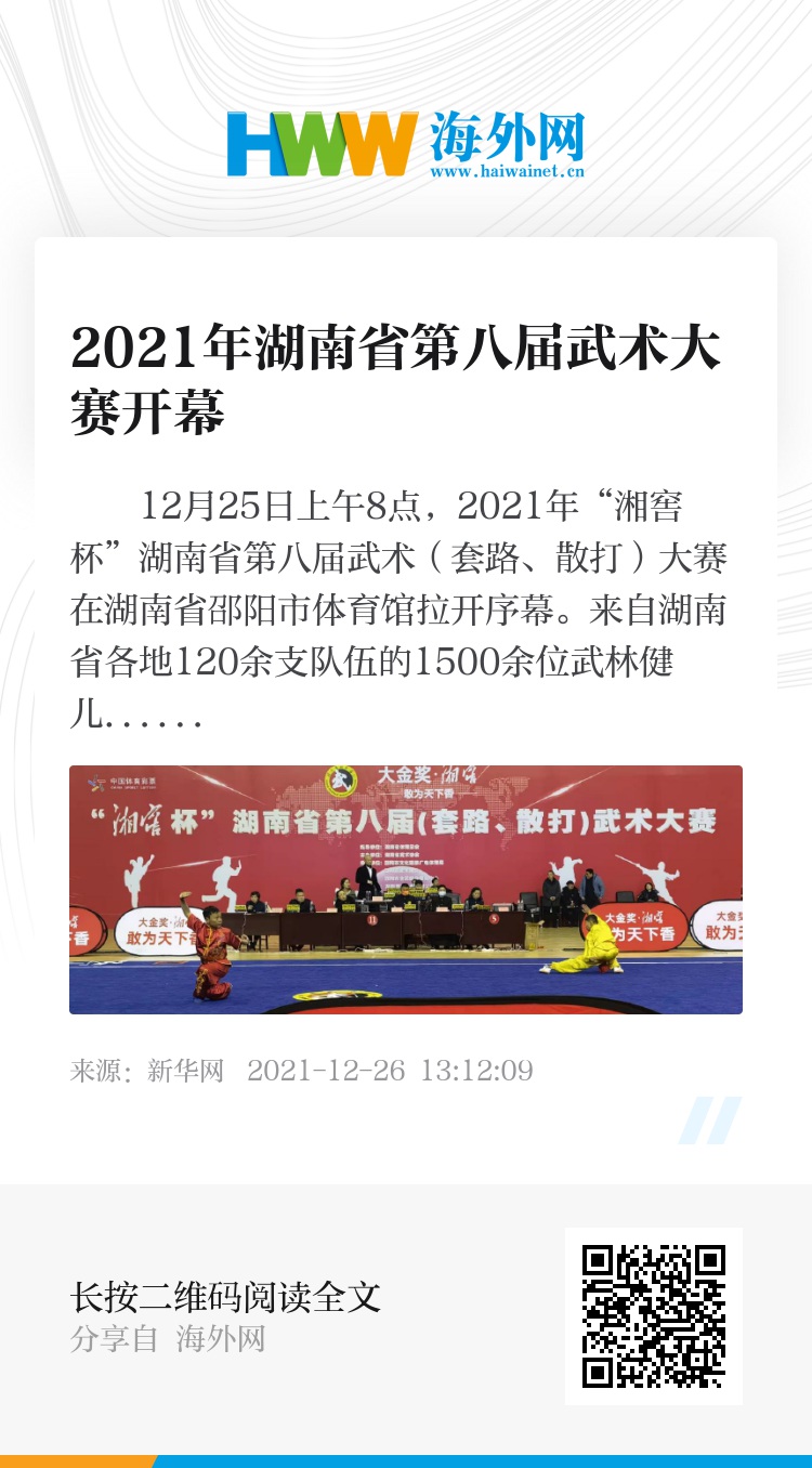12月25日上午8点,2021年“湘窖杯”湖南省第八届武术(套路、散打)大赛在湖南省邵阳市体育馆拉开序幕。来自湖南省各地120余支队伍的1500余位武林健儿将在此展开为期两天的较量,比赛分武术套路、散打比赛进行。